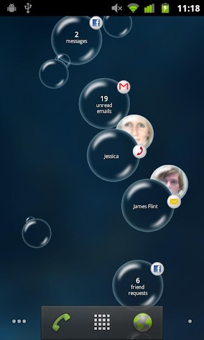 You get a new bubble each time you receive a sms/mms or miss a phone call If you have a picture attached to the number the picture will be attached to the bubble. Tap, pop, the bubble and the phone log or the sms conversation opens. You can also have a couple of empty bubbles floating around which you can pop for your own fun.
